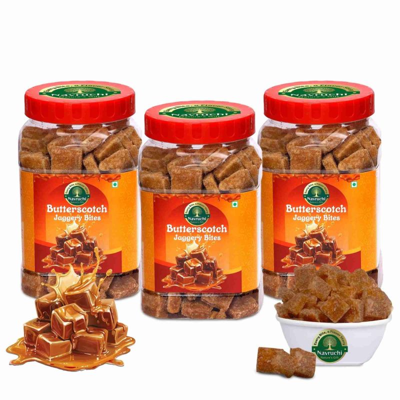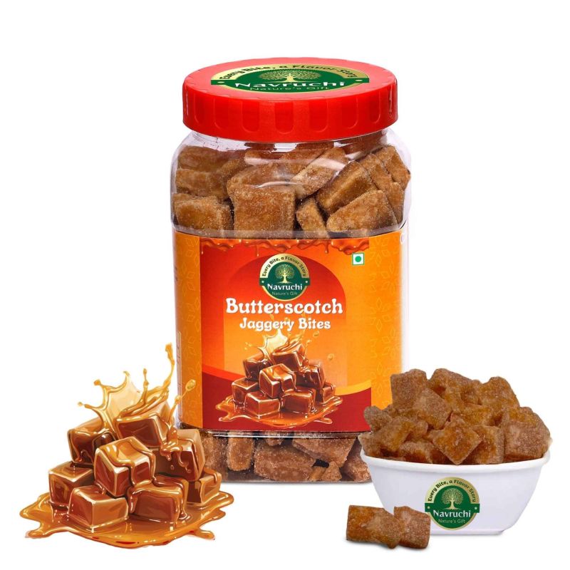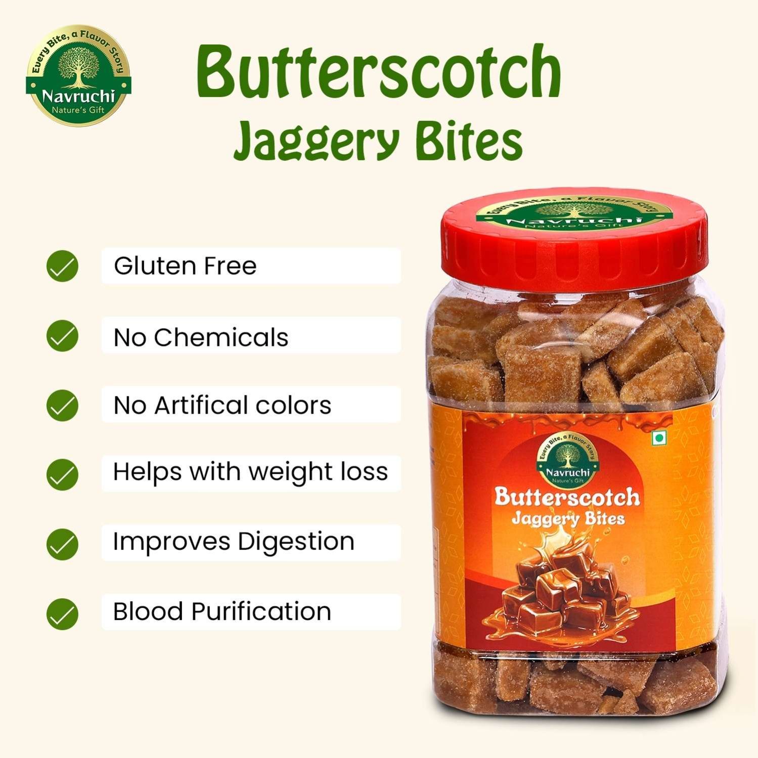 Navruchi BUTTERSCOTCH Flavoured Jaggery Bites | Natural Healthy Sweet | Pure 100 % Chemical-Free, Sulphur Free Jaggery Snack | Immunity Booster, Energy Bites|