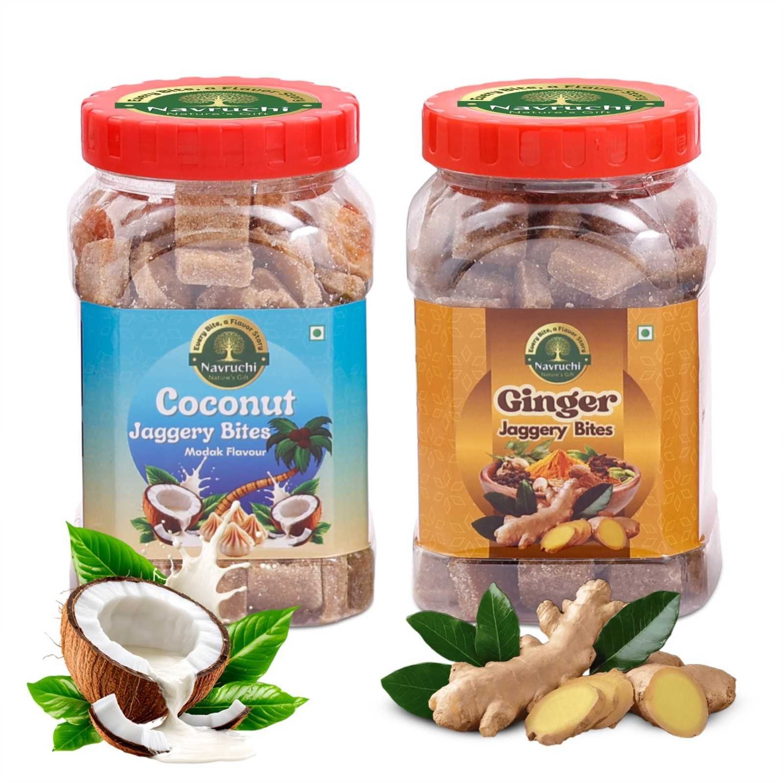 NAVRUCHI Natural Flavoured Jaggery Cube Combo ( Coconut & Ginger) | Pure Traditional Jaggery | No Chemicals, No Preservatives | Natural & Sulphur free | Alternative to Sugar | Wholesome Sweetener for Daily Health | Immunity Booster | 500g | Pack of 2